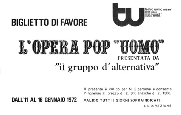 Buono sconto per lo spettacolo al Teatro Uomo di Milano, gennaio 1972 |